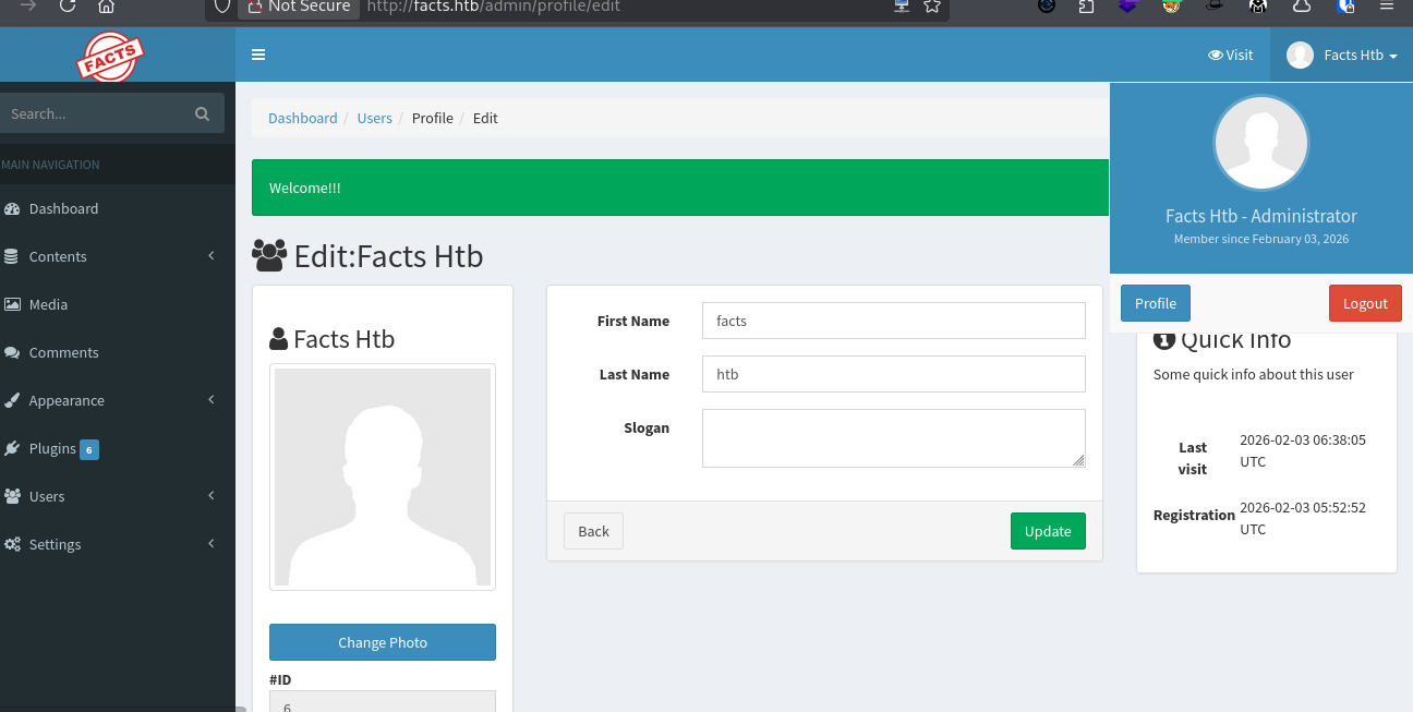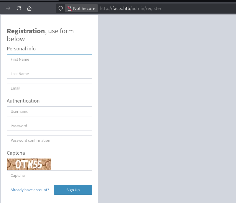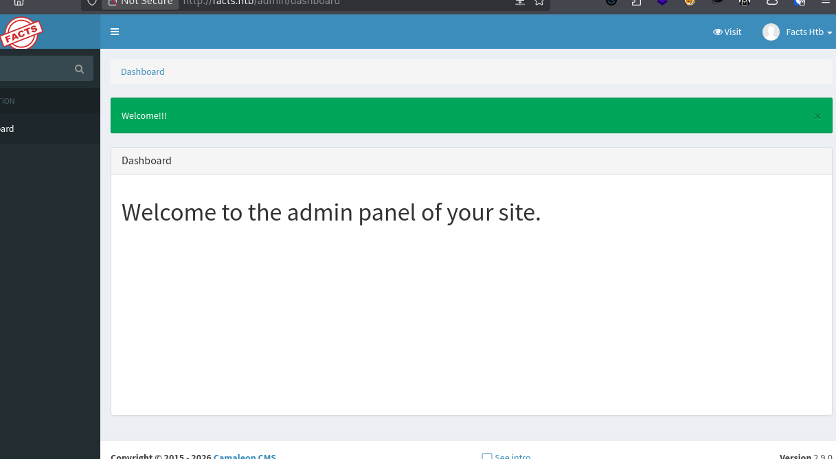 http://facts.htb/admin (e.g., username: test, role: Client).